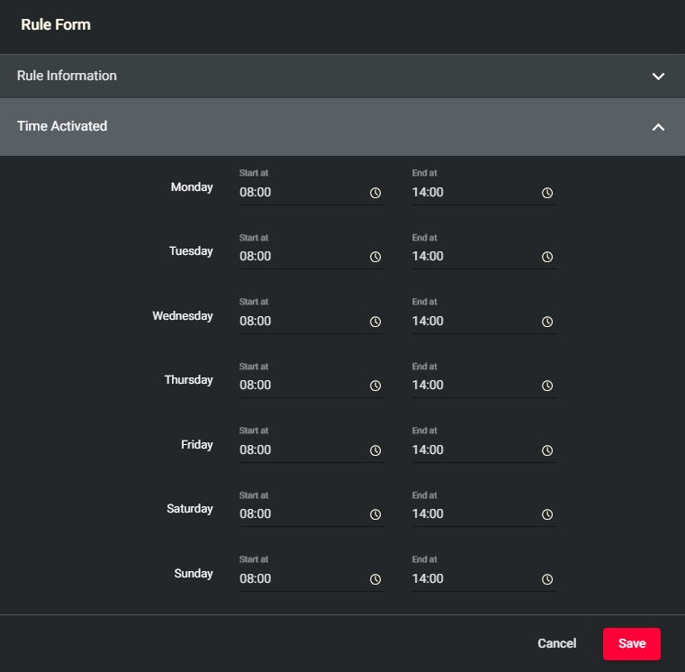 IMPORTANT!The rule always applies to the full minute specified. This means that if 11:59 PM is selected, the rule remains in effect until the clock strikes 12:00 AM.