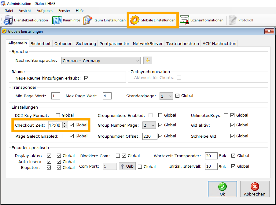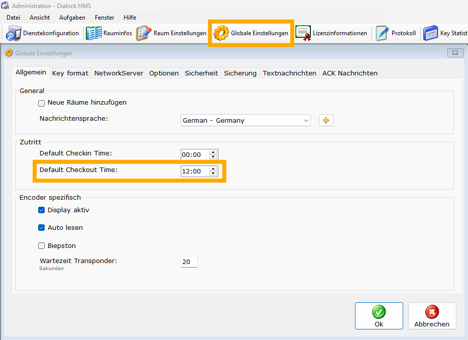 3. Sie sollten im Reiter "Allgemein" nun die "Checkout Zeit" bzw. "Default Checkout Time" sehen.