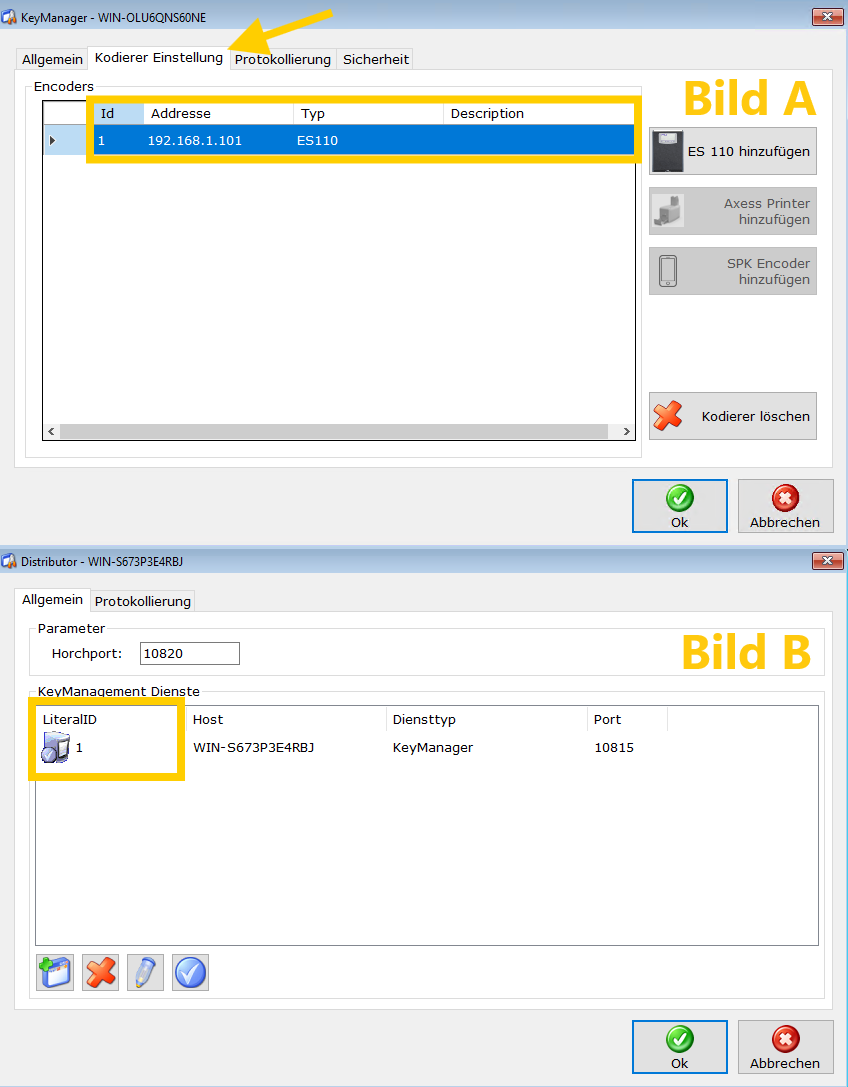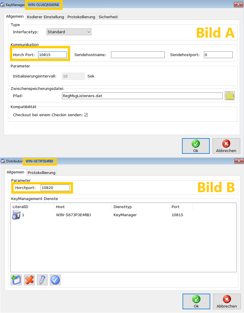Im Beispiel sind die Angaben für den KeyManager (Bild A):
