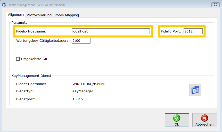 Nun können Sie den Fidelio Hostname und den Fidelio Port wahlweise prüfen bzw. anpassen. Beide Angaben erhalten Sie von Ihrem PMS.