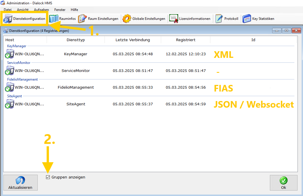Öffnen Sie nun die Dienstekonfiguration und setzen Sie den Haken bei "Gruppen anzeigen". Dadurch werden alle in Ihrem System installierten Dialock HMS Dienste nach Ihrer Funktionsweise bzw. der Art Ihrer Kommunikation gruppiert.