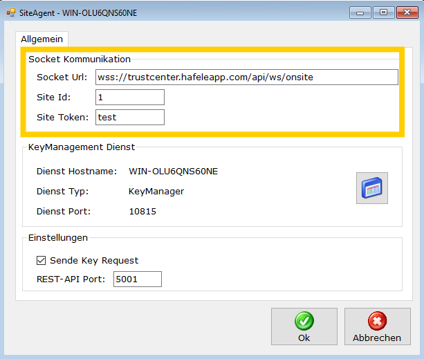 Nun können Sie die Socket Url, die Site Id sowie den Site Token prüfen bzw. anpassen. Alle drei Angaben erhalten Sie von Ihrem PMS.