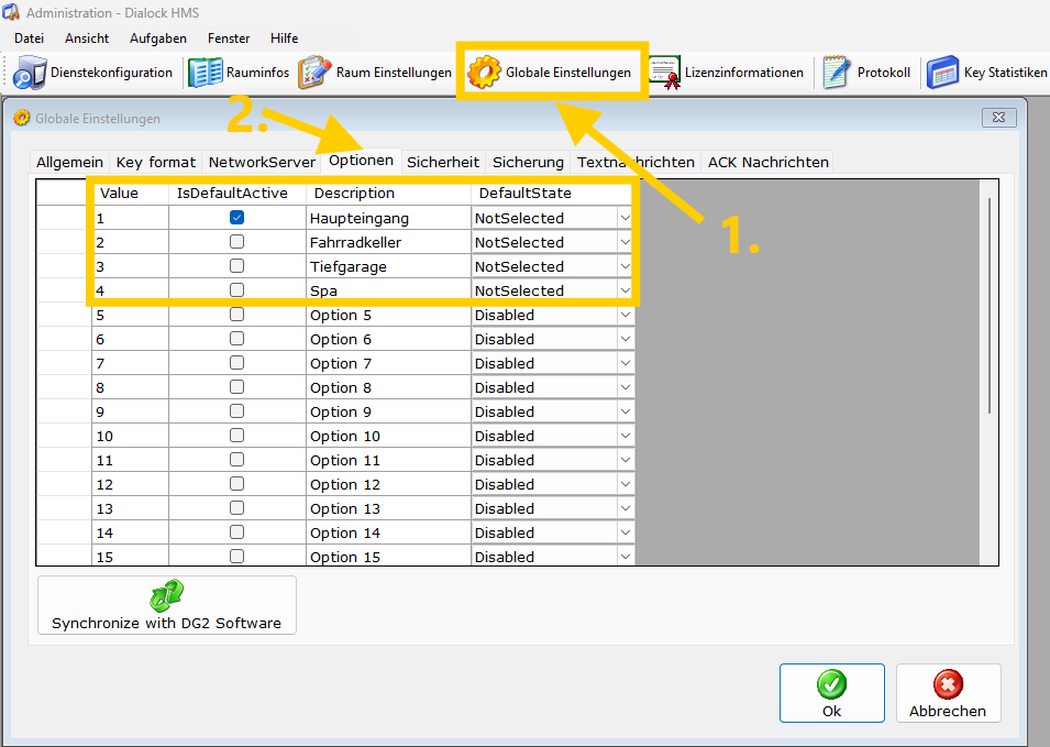 Teilen Sie dem PMS die Values sowie die Descriptions aller Optionen mit, die als DefaultState nicht auf Disabled stehen.