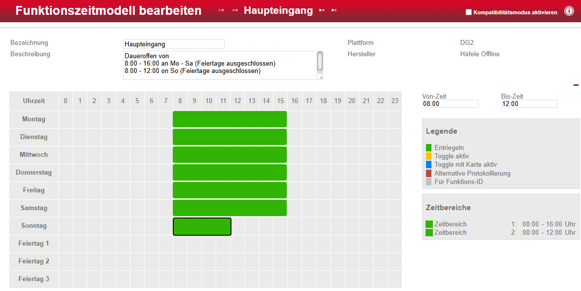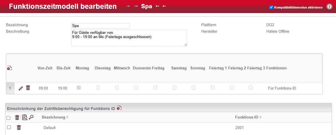 Falls Sie den Zutritt der Gäste zeitlich beschränken wollen, wählen Sie die Default Funktions-ID 2001.