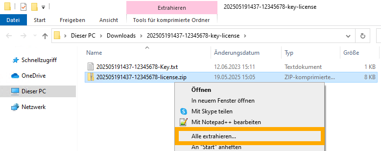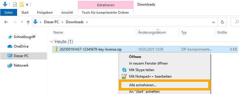 Klicken Sie mit Rechtsklick auf die heruntergeladene "-key-license.zip"-Datei und wählen Sie "Alle extrahieren" aus.