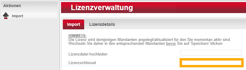- Klicken Sie im linken "Aktionen"-Menü auf "Import", um die Lizenz einzuspielen.