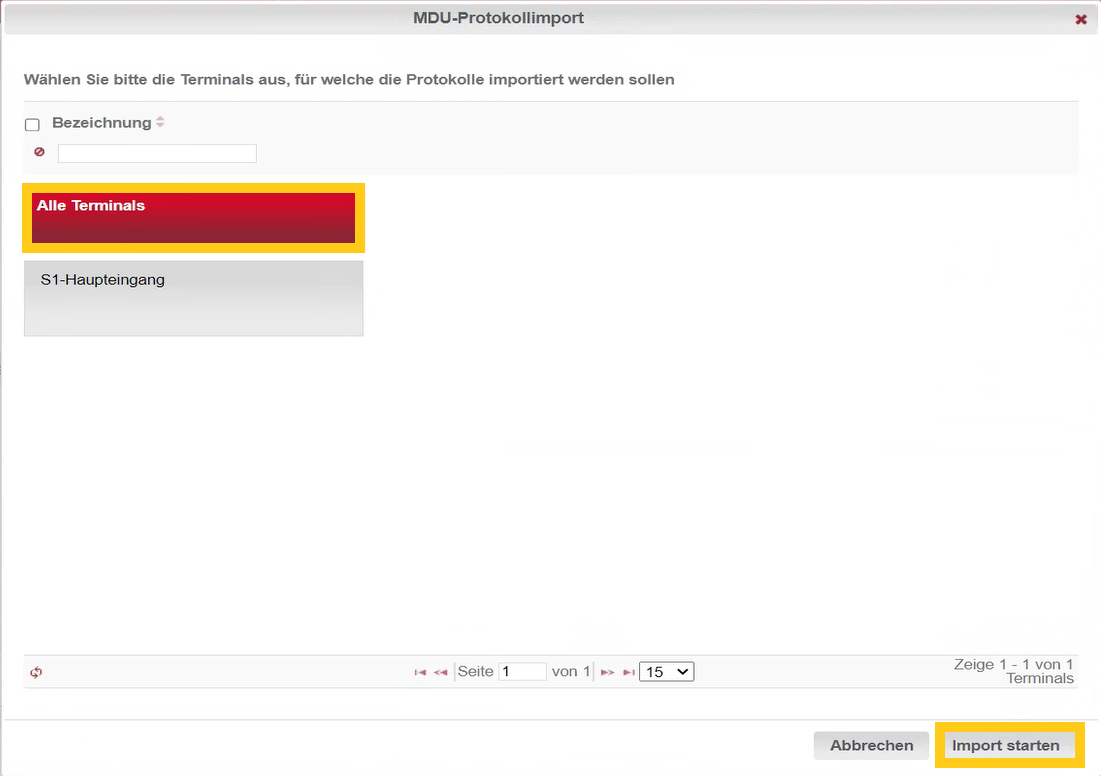 Aus dem neu geöffneten Fenster "Alle Terminals" auswählen und auf "Import starten" klicken, um die Übertragung zu beginnen.