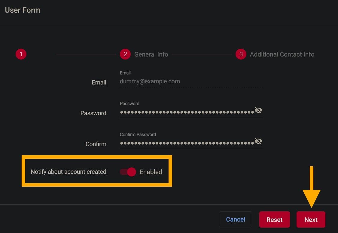 2. "Notify about account created" aktivieren, damit der Nutzer via E-Mail über die Erstellung seines Accounts informiert wird.