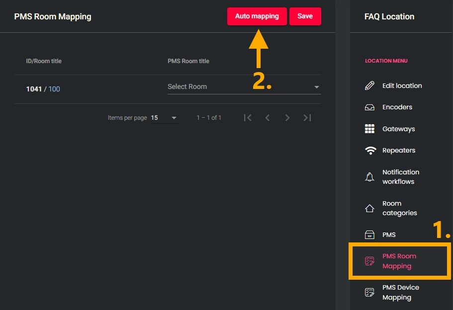 - Den "Auto mapping"-Knopf drücken, um Räume aus dem PMS zu laden und automatisiert zuzuweisen.