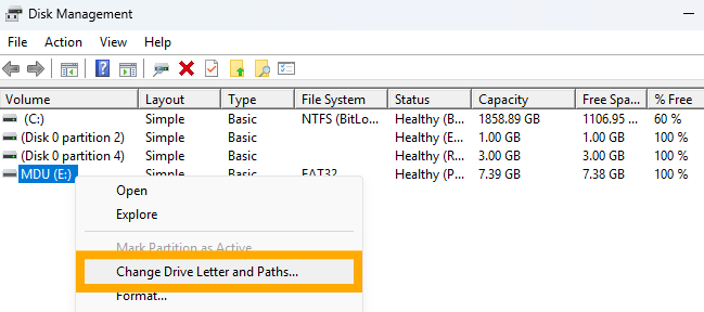 - Right-click on the MDU and select “Change drive letter and path”.